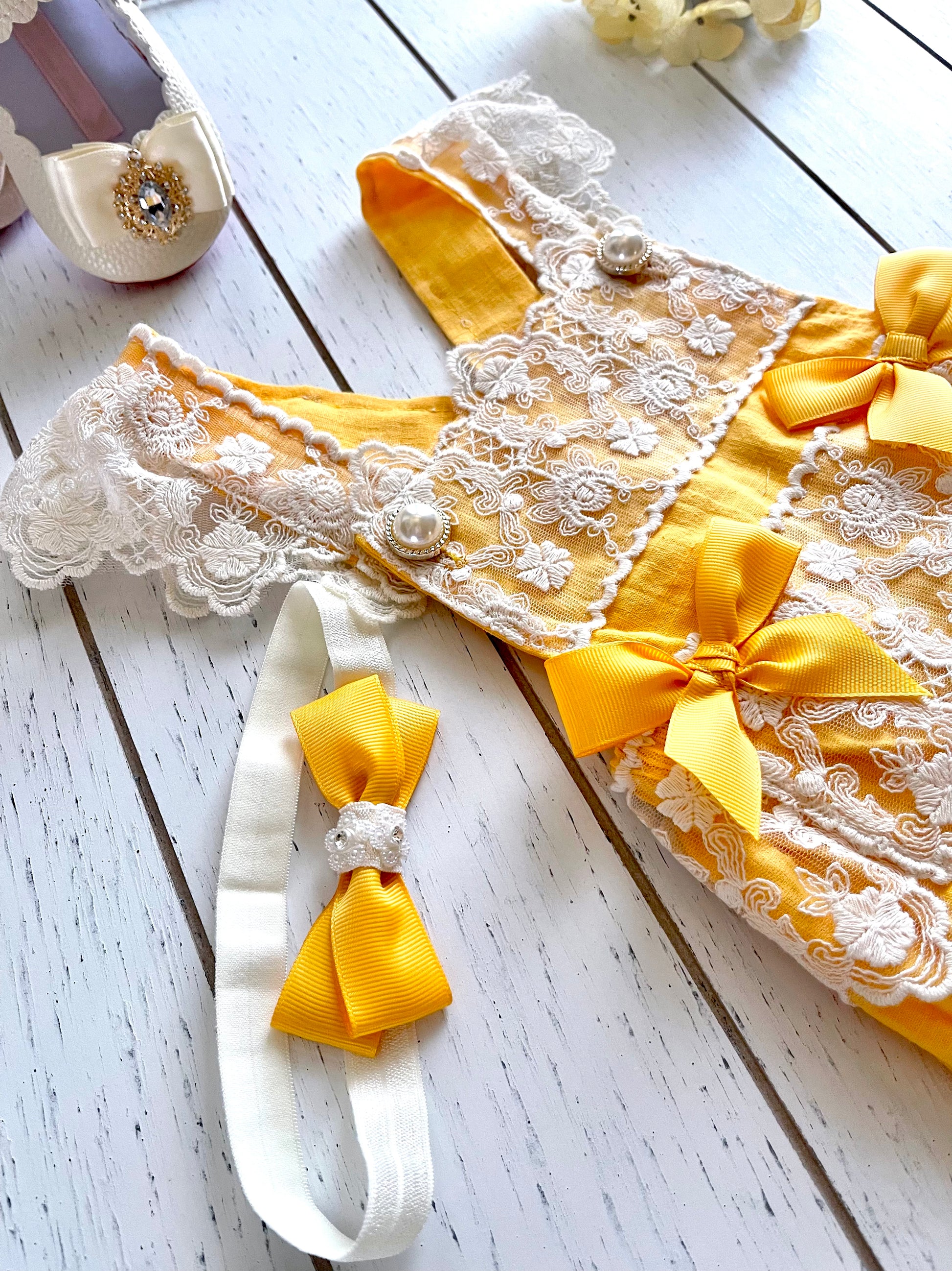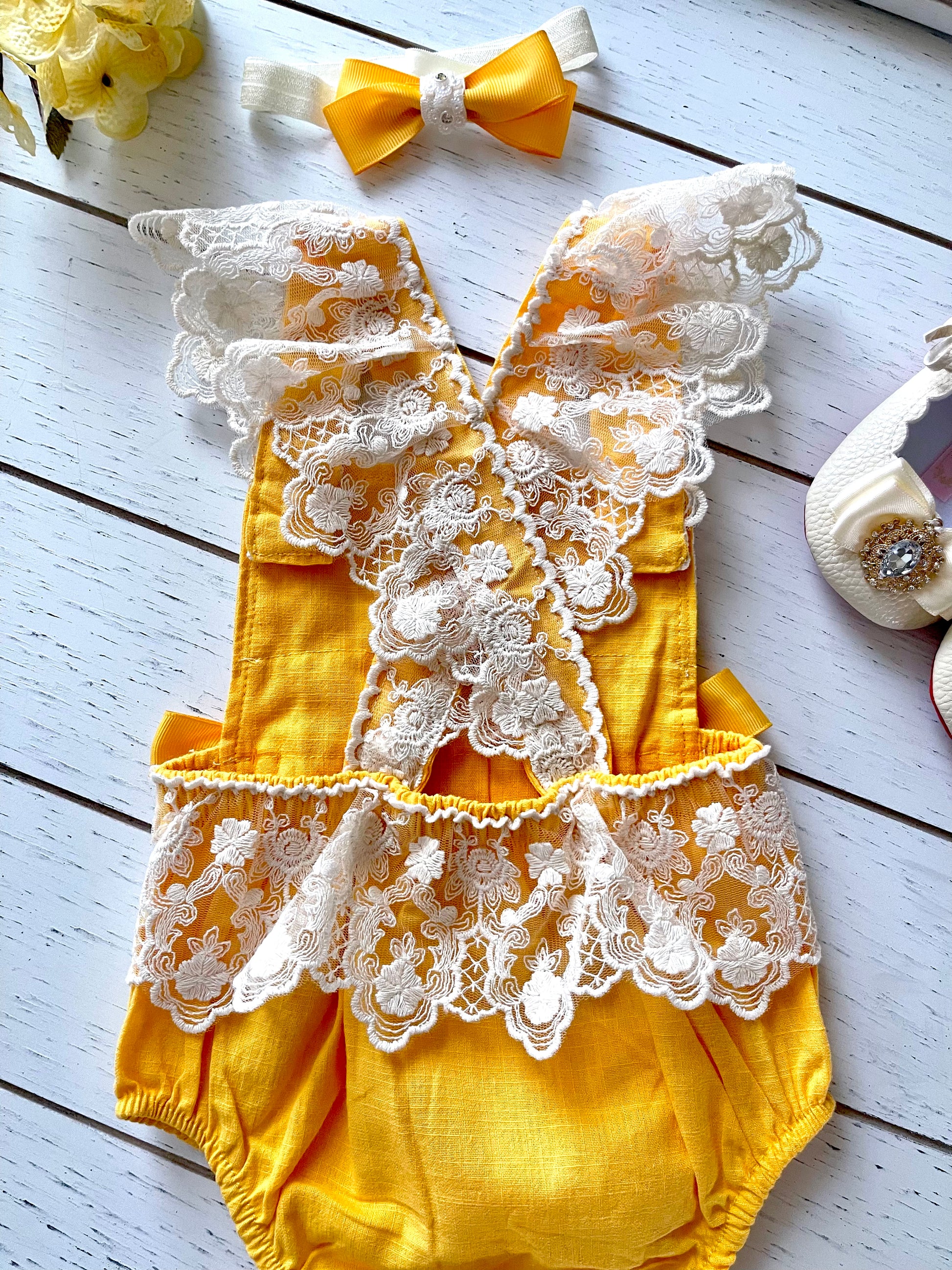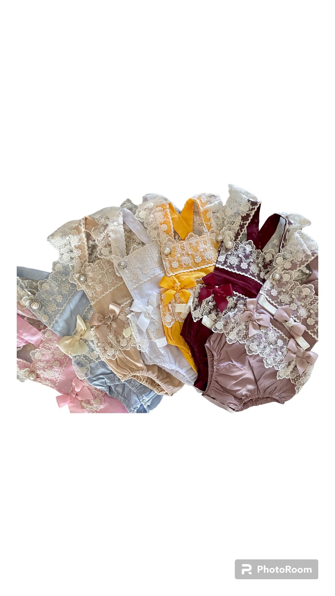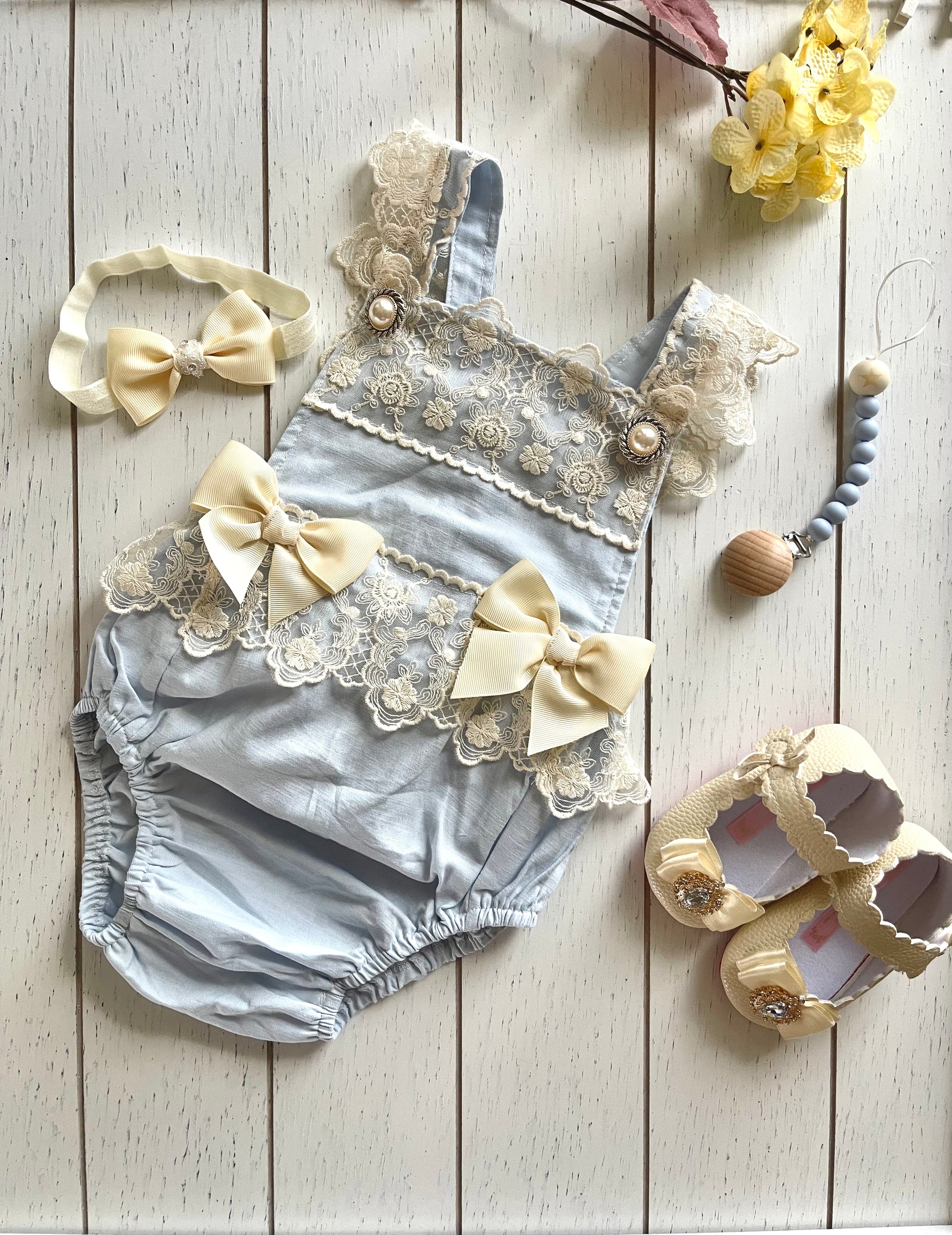 100% cotton and linen fabric handmade girl overalls, with beige cotton soft lace ruffles on straps and waist. Ribbon bows on each side. Beautiful peal buttons on straps. Ribbon Bow headband included to match. Summer outfit. To wear with or without an under shirt. It has snap buttons on bottom for easy wear. This vintage cute girl overalls it’s available on different colors and sizes.