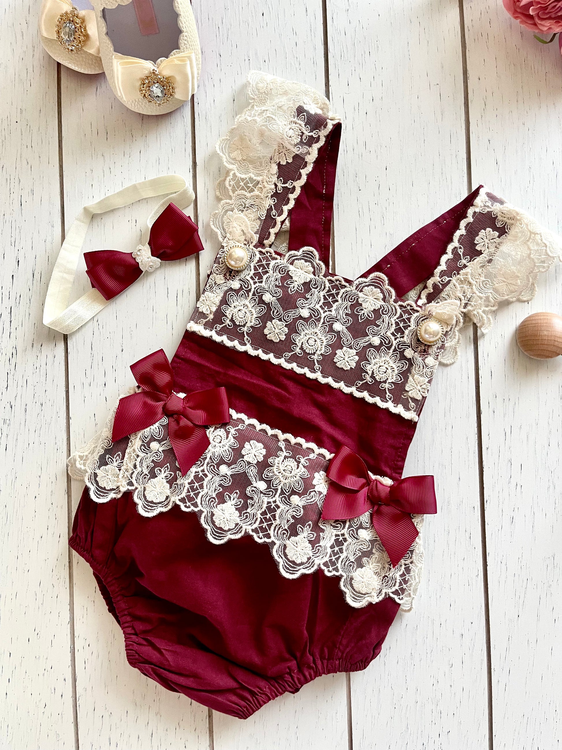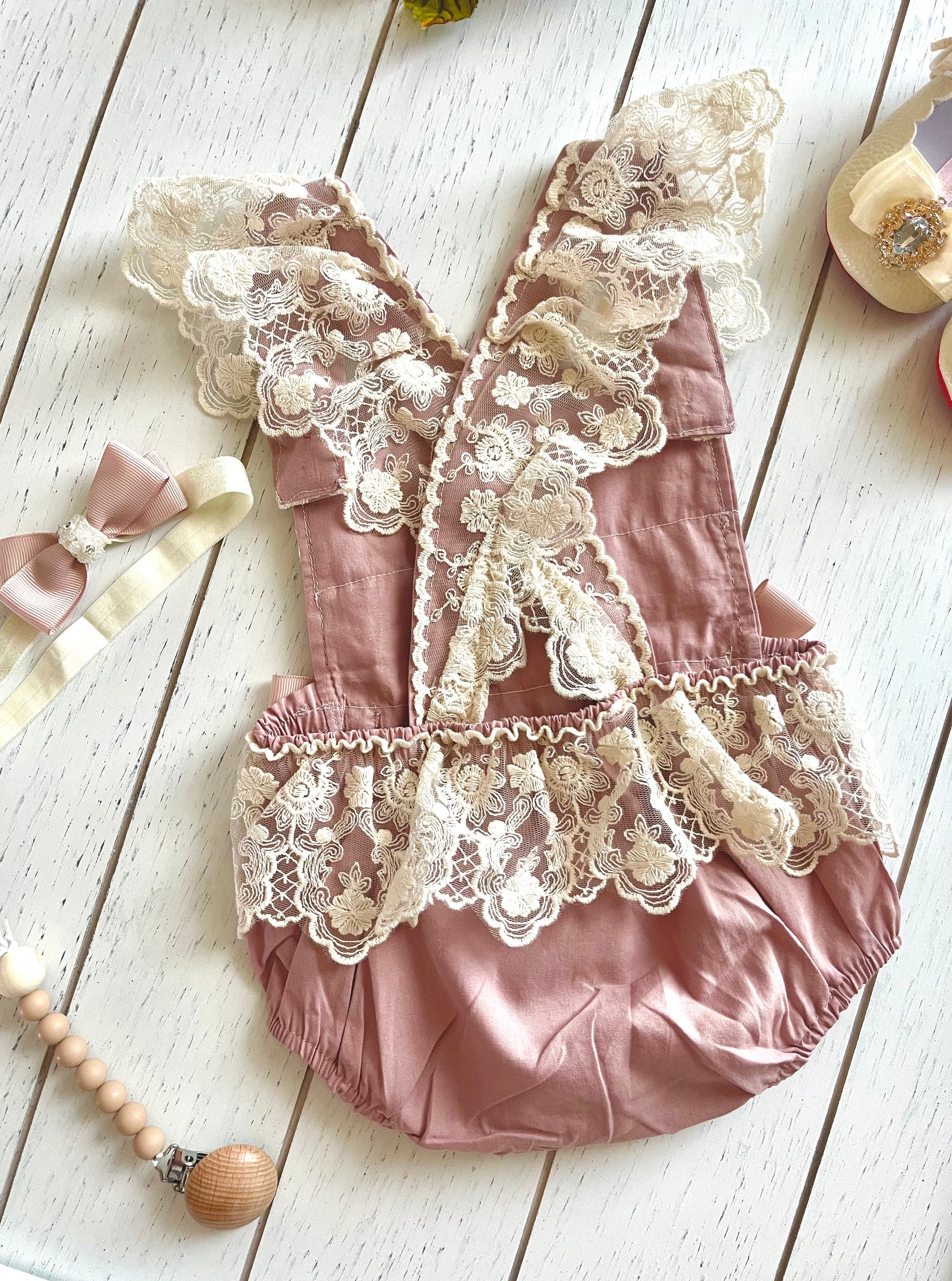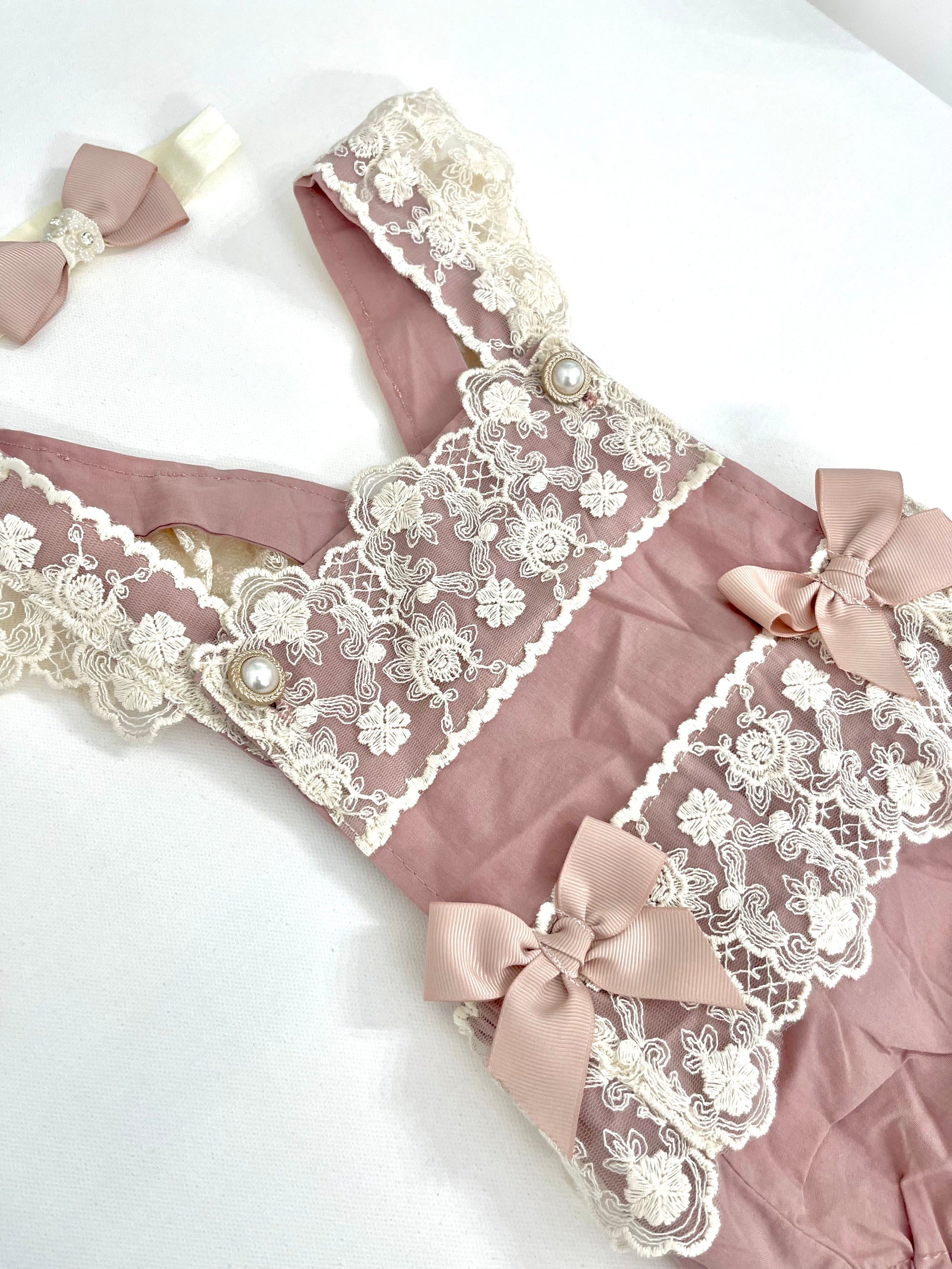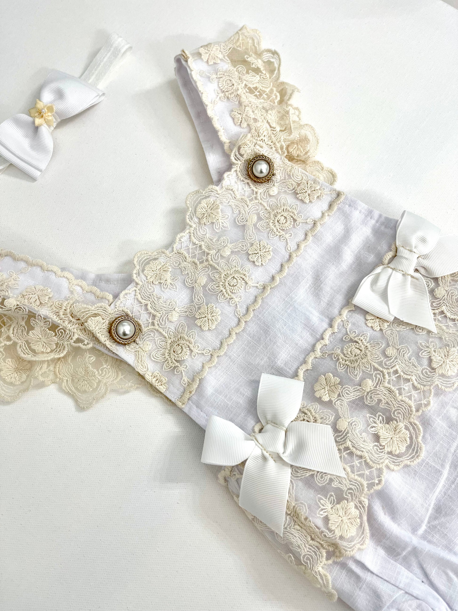 Lacey Ruffles Pearl Buttons & Bows Girl Romper Overalls