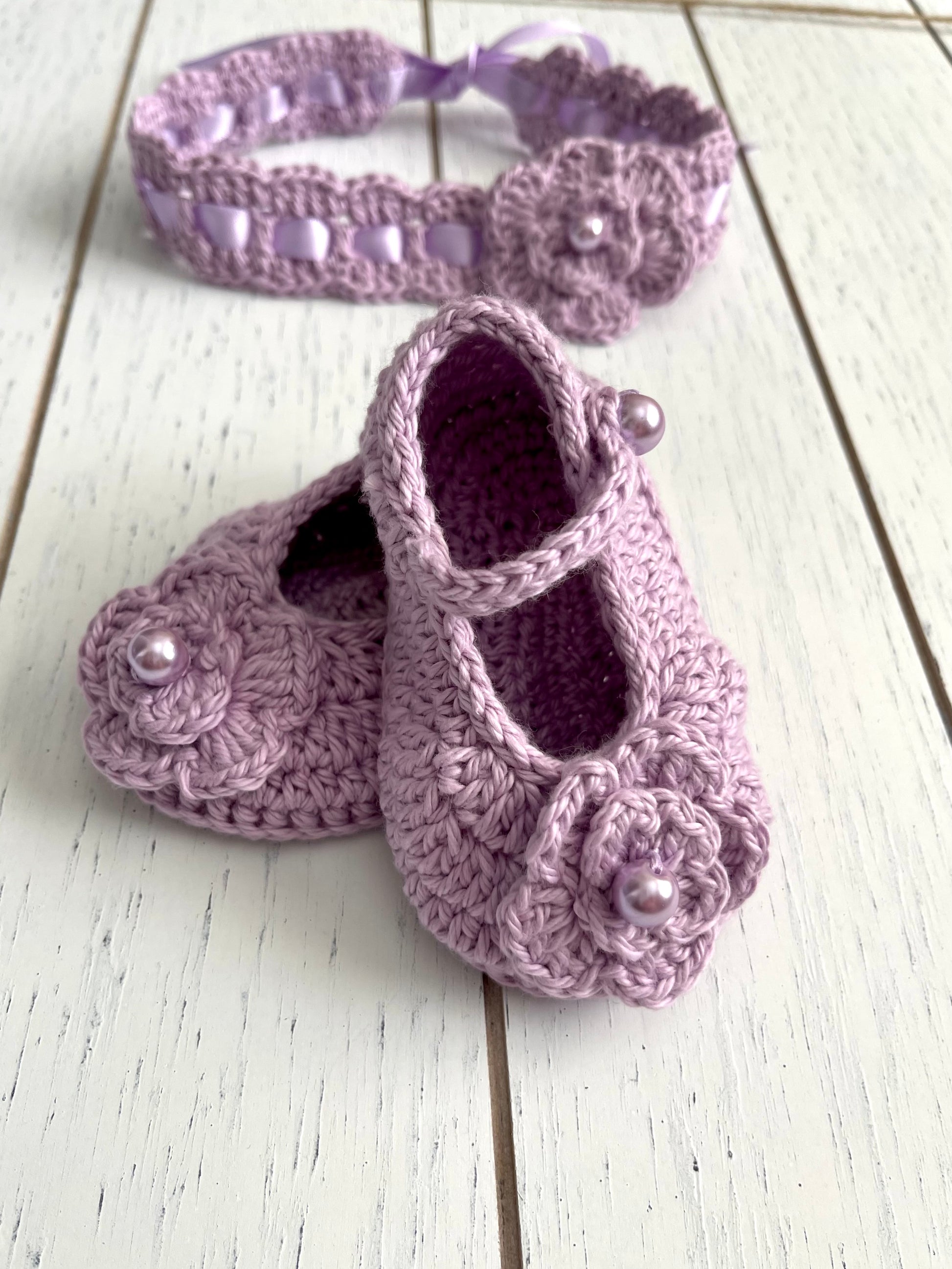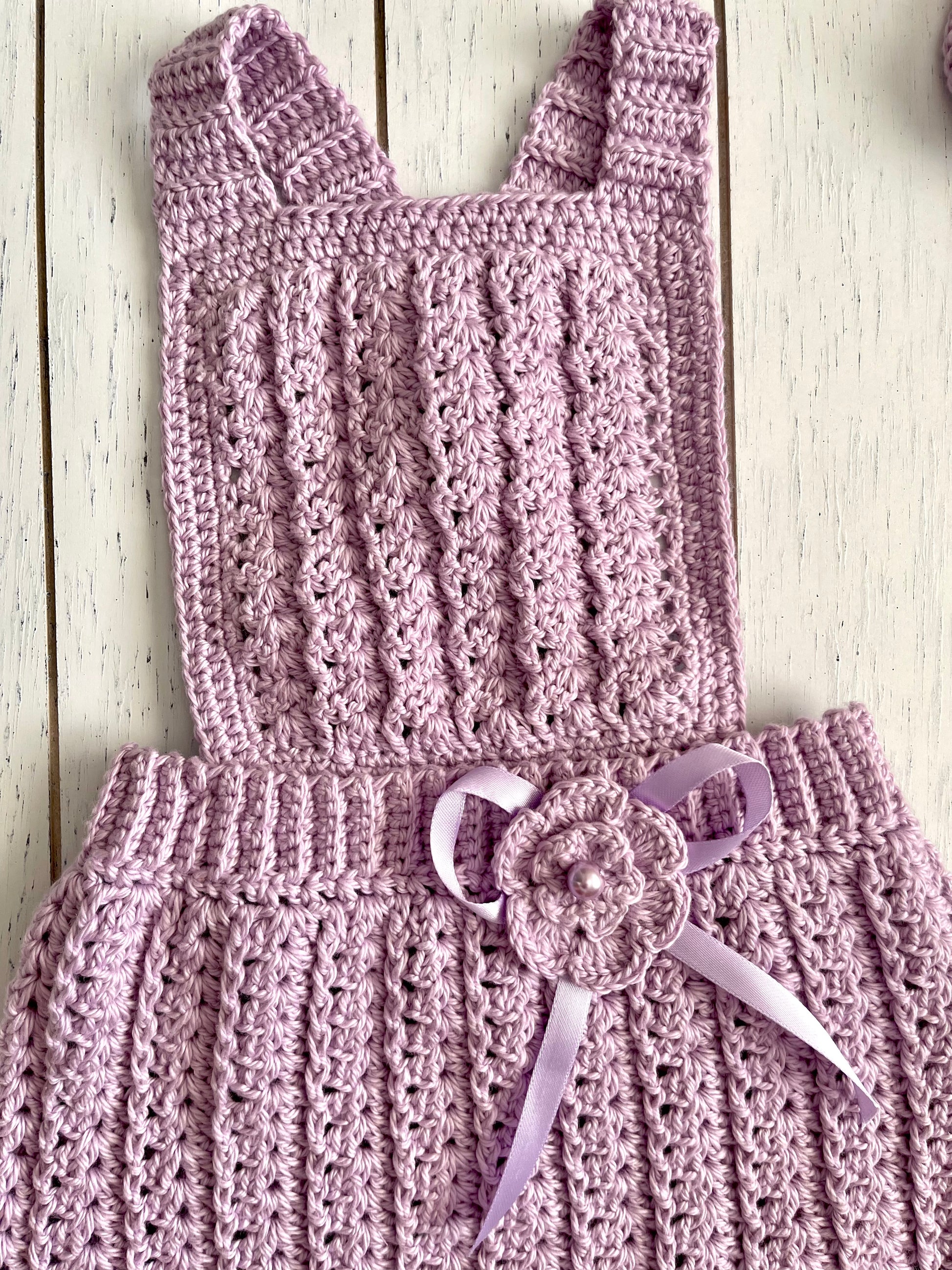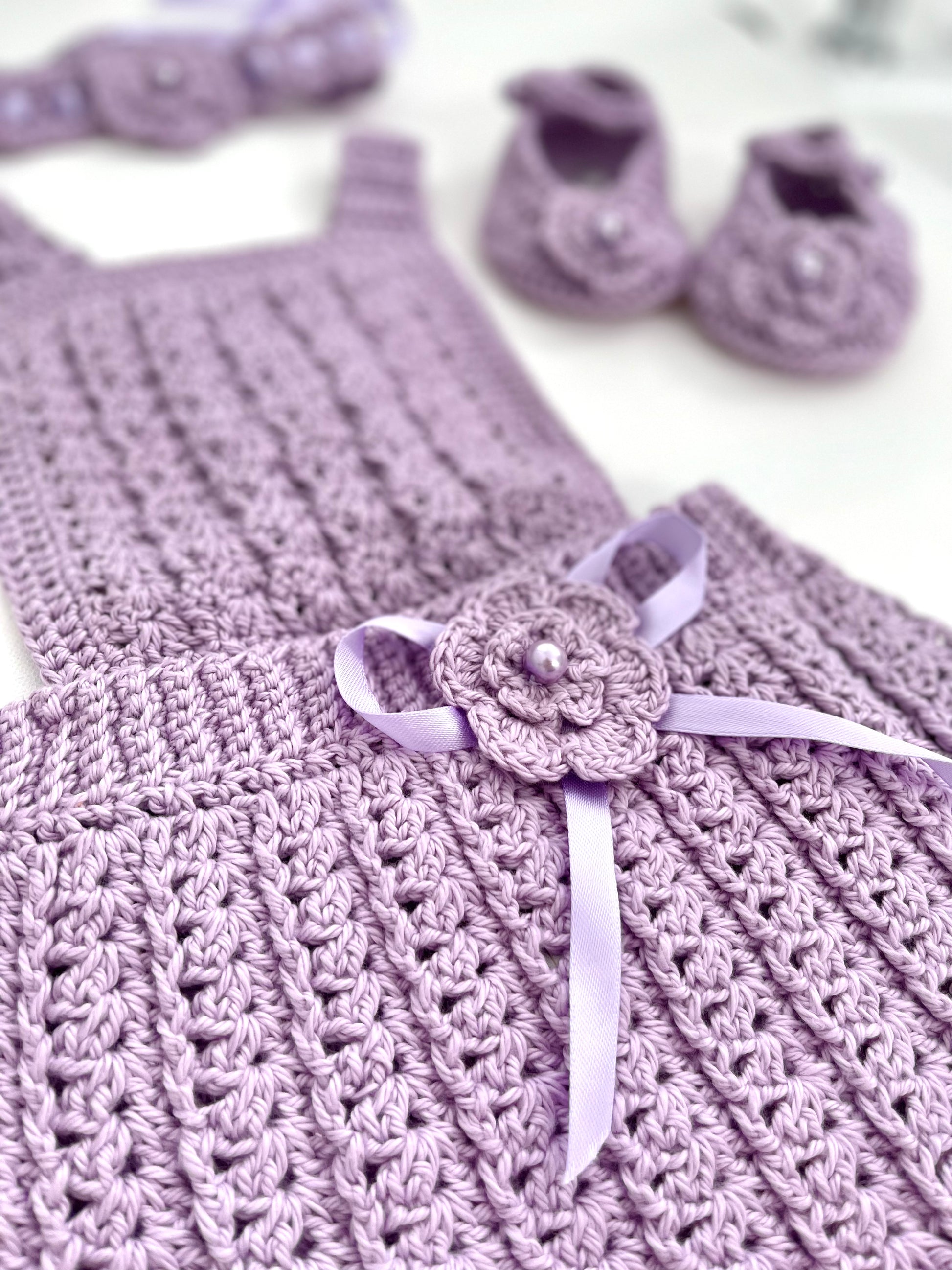Soft organic cotton crochet knitted Overalls girl set with flower and pearl shoes, and flower and pearl headband with ribbons. Buttons on the back straps to adjust size and bottom fir easy diaper change. Size 6-12 months.